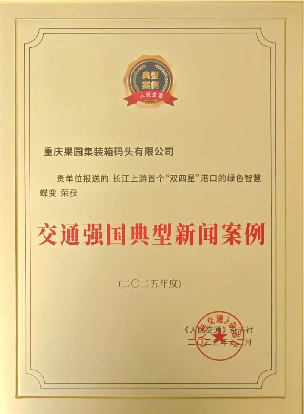 近日,2025人民交通大会在福建省福州市召开,果园集装箱公司报送的新闻特稿《长江上游首个“双四星”港口的绿色智慧蝶变》荣获《人民交通》杂志社“交通强国典型新闻案例(2025年度)”。
