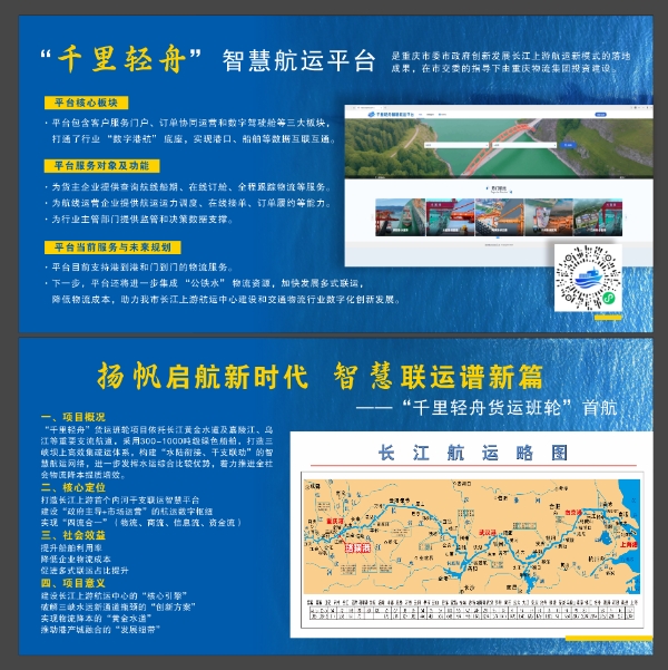 “千里轻舟”货运班轮依托长江黄金水道及嘉陵江、乌江等重要支流航道,采用300-1000吨级绿色船舶,按照“定港口、定航线、定班期、定时刻、定船舶”的“五定”班轮模式运行,构建三峡坝上“水陆衔接、干支联动、宜水则水、大小适宜、船货匹配”的集疏运服务体系。“千里轻舟”智慧航运平台以“数字港航”数据中心为基础底座,完善货源统一组织、港口和船舶智能调度、“公铁水”多式联运协同、长江上游航运指数发布、物流全过程上链等功能,支持船期在线查询、舱位实时预订和物流动态跟踪,实现全程物流数字化运营和多方协同管理。